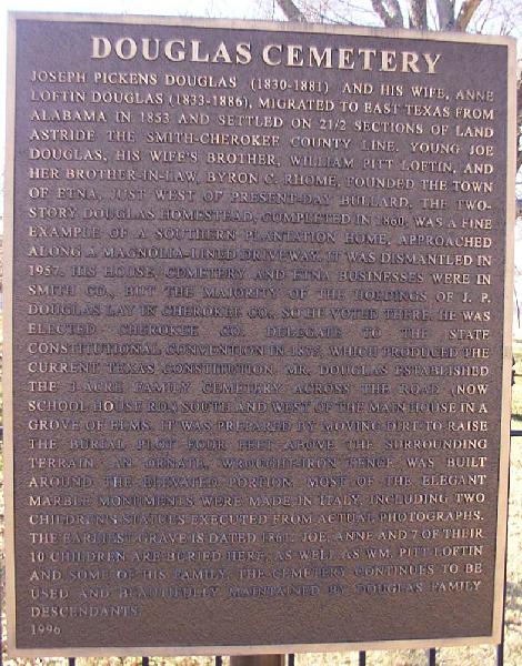 Douglas Cemetery is located about two miles southwest of Bullard School. From the intersection of FM 2493 & FM 344 go west .3 miles to School House Rd. Turn left on School House Rd & go .5 miles, the cemetery is on the right. Many of the monuments in this cemetery were made in Italy of Italian marble. One has a life size child sitting on top of the monument. Another has a larger than life boy carrying a horse bridle.